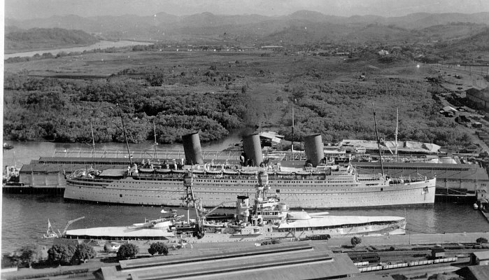 Seen at Pier 18 is the Canadian Pacific Line's Empress of Britain. The Empress was the largest vessel ever built for a Canadian line, in 1931. In 1939 she became a troop transport and in October 1940 she was bombed and heavily damaged by Luftwaffe patrol aircraft. While under tow she was sunk by a German submarine, the largest noncombatant to be lost in the war.