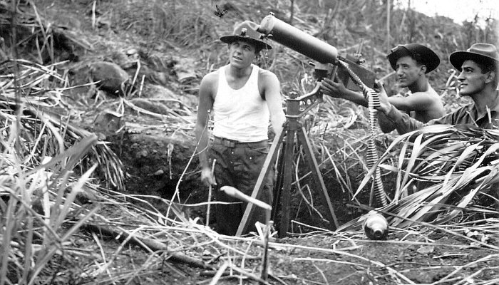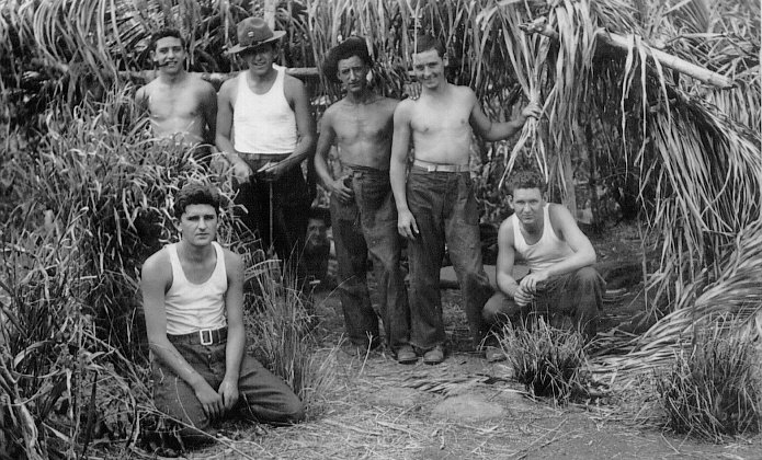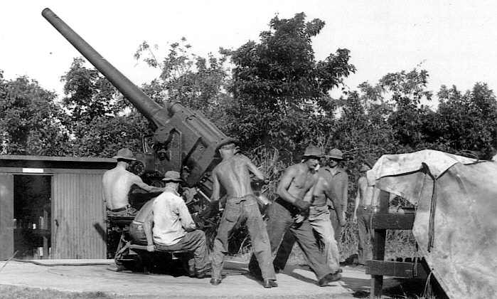 Here are the men of Battery 15 at their jungle emplacement. Even posing for photos shows a rough life. My Grandfather, in the center, told us that they were given ten days of rations and sent out into the jungle to man their gun emplacement several miles from the Pacific end of the Panama Canal. He told of being at the gun site on December 7 1941 and hearing of the attack on Pearl Harbor. They pulled out their maps and calculated the best transit time from the Hawaiian Islands to Panama, as they expected the Japanese to attempt to disable the Canal to prevent the US Atlantic Fleet from quickly augmenting the remains of the Pacific Fleet.