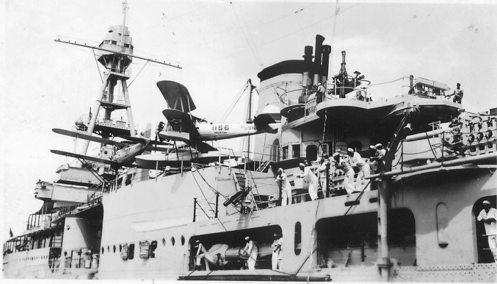 Alongside the Empress of Britain is the USS Pennsylvania (BB-38). She was commissioned in 1916, the first of her class. She survived the war and both of the Bikini Atoll atomic tests and was scuttled in 1948. The Pennsylvania earned 8 battle stars for her service during WWII.