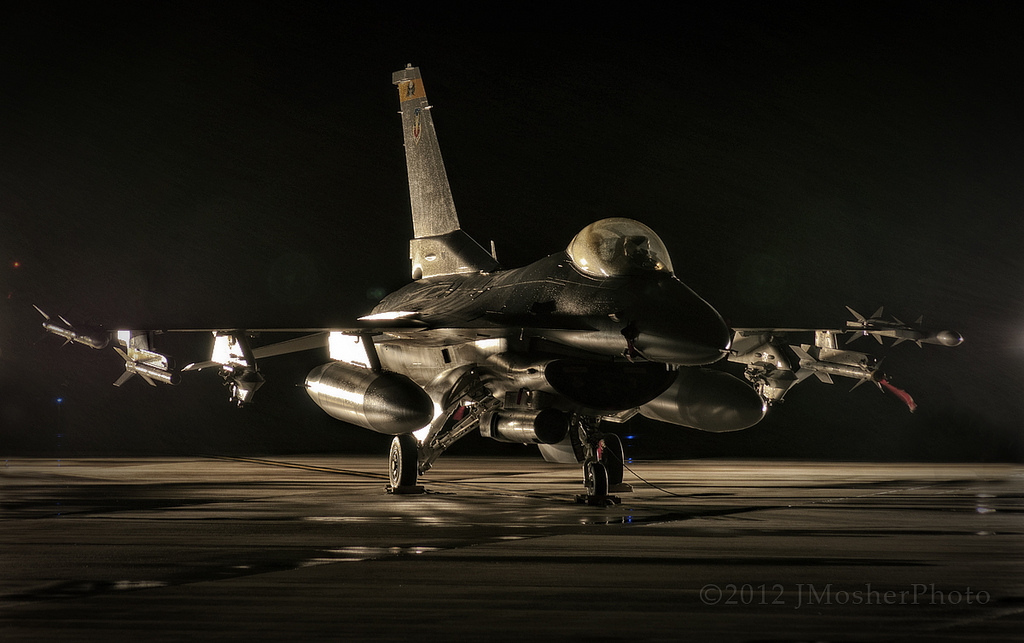 - Jeremy Moshers night photo of an F-16 Fighting Falcon on a misty ramp also grabbed everyones attention. The backlighting on the Viper brought about a different effect than is usually seen in night photos. To quote the nominations, "Just stunning, perfect light to show off the lines of a Viper!" and "a static shot but oh so amazing". We agreed that while this was a photograph of a static aircraft, the photographer was successful in capturing a quiet moment in a Vipers life. One judge commented that the image reminded him of a spider sitting and waiting for prey to walk close enough to attack.