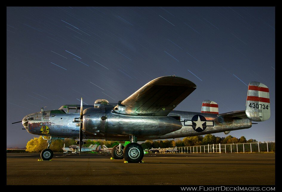 - Our first example for October is of an airshow favorite, the B-25 "Panchito," taken at night by Flighdeckimages. Many of the judges acknowledges the beauty of the aircraft itself, the bright silver punctuated by the red stripes and yellow nose art. The background of trees and other aircraft adds realism. The shooting stars expose the talent of the photographer to be able to get just the right F-stop and exposure to balance everything. This photo belongs in a large-format print on an "I love me" or museum wall.