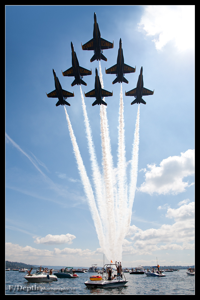 - A POTM judging session seems to not be complete without a stunning Blue Angels shot and do we have one here. Many of us remarked that this is not an image wed seen before. Notable about Mike Darcys Blue Angels crossing shot is the compression effect of shooting with a long lens -- both jets look like they are right on top of one another. But if you look close, there is that subtle tag of engine exhaust plume crossing right down the middle of #2 that reminds you the other jet, #3, came first. The subtle details, such as the slightly open airbrake on #3, and the rich colors of the blue and gold, round out and dominate this photo.