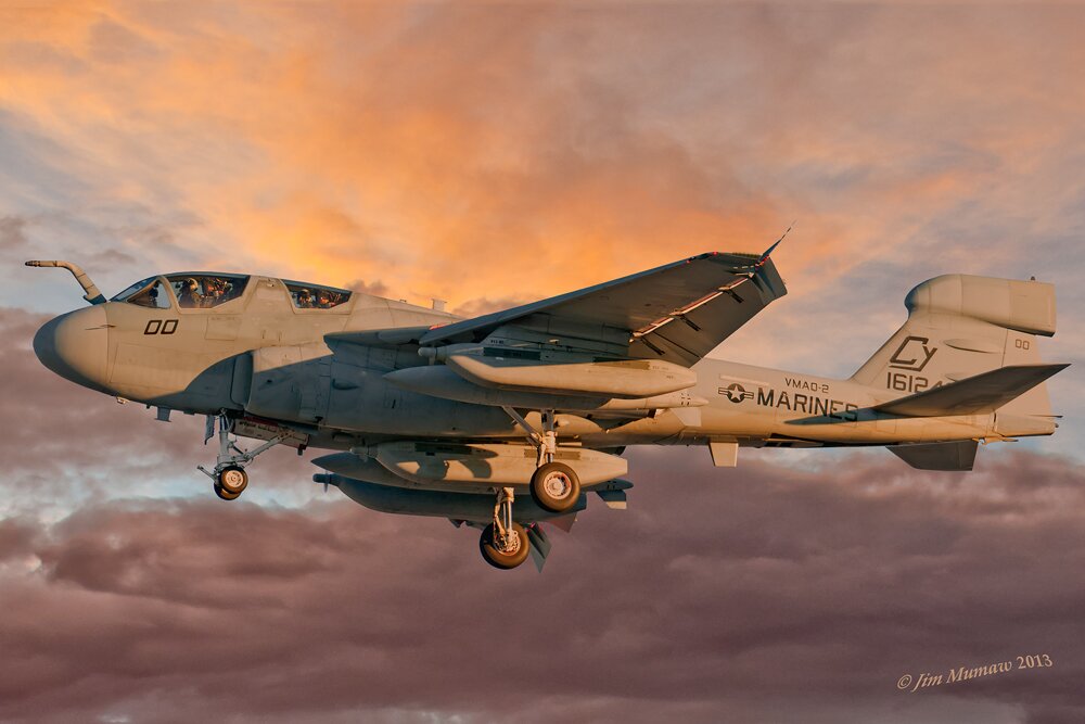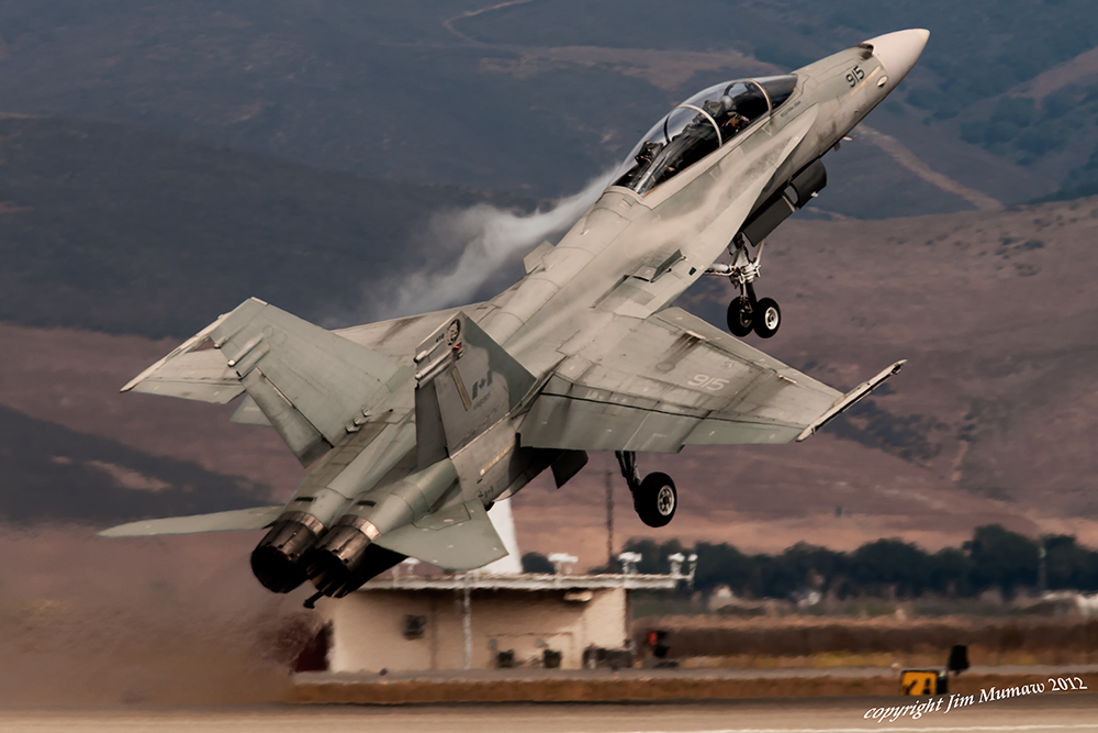 Our second image, from Jim Mumaw, is a tight shot of a VAQ-135 Growler launching during a Red Flag mission. The sharpness, close framing, and eye-catching "prop blur" of the ram-air turbines on the jamming pods were factors that drew several of the judges to select this shot. [Forum Link]