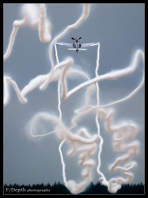 - Kevin Scott's T-28 working its wingtip vortex generators. The play of the light and shifting shapes of the vortices made for a very interesting and creative image.